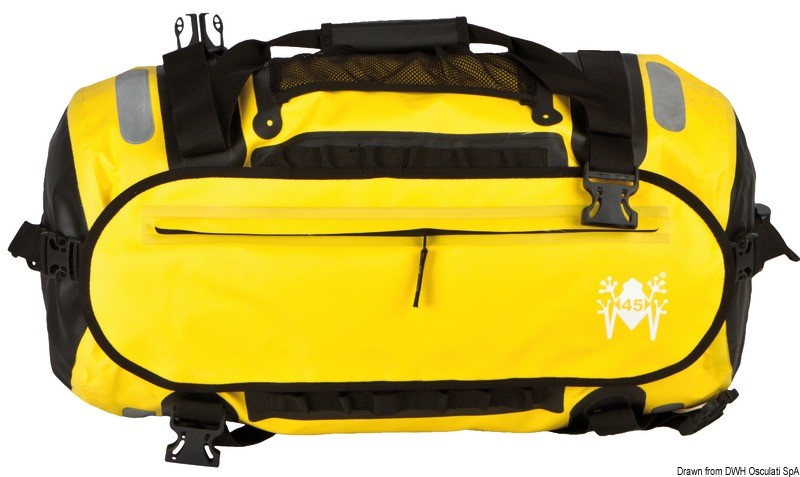 Borsone stagno a sezione circolare con sistema ultra fix per agganciare moschettoni o altro, bande rifrangenti, tasca a rete, tasca esterna water resistant.