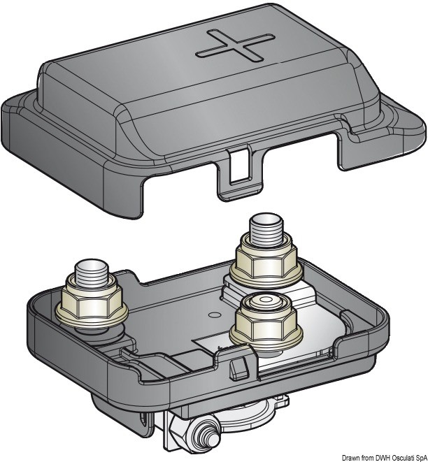 Box in termoplastica con coperchio, da utilizzare sul polo positivo batteria.Completare con fusibile MEGA. Portata max 200 A.