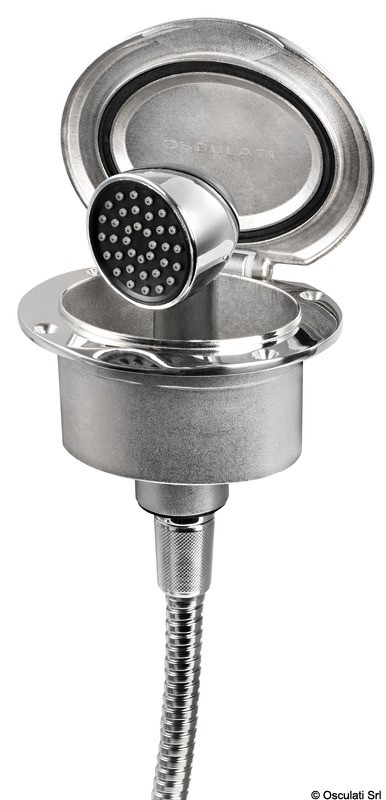 Vano doccia in acciaio inox AISI 316 con sportello autoreggente. Dotato di doccia Keji II Continuum Flow con testa maggiorata e boccola interna in gomma antivibrante.