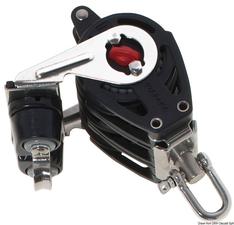 Con sfere in acciaio inox + cricco. Puleggia Ø 57 mm, scotta max Ø 10 mm, carico di rottura 900 kg, carico di lavoro 205 kg.