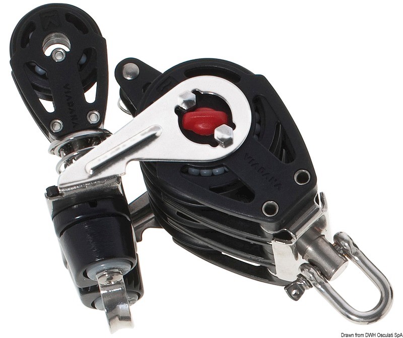 Con sfere in acciaio inox + cricco. Puleggia Ø 57 mm, scotta max Ø 10 mm, carico di rottura 900 kg, carico di lavoro 205 kg.