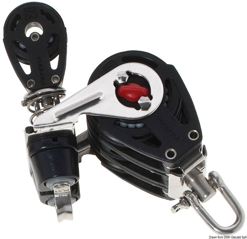 Con sfere in acciaio inox + cricco. Puleggia Ø 57 mm, scotta max Ø 10 mm, carico di rottura 900 kg, carico di lavoro 205 kg.