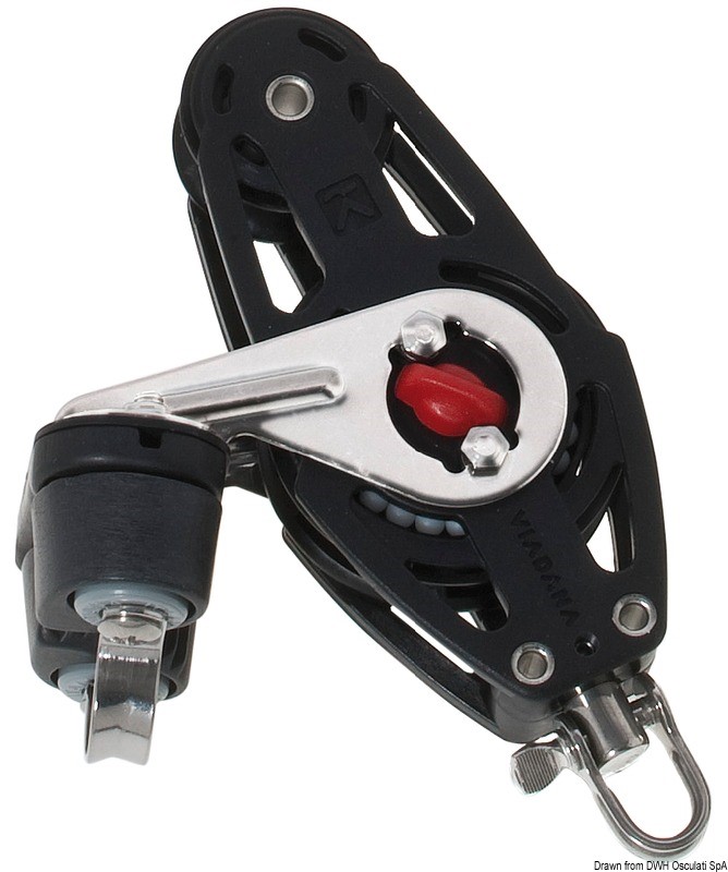 Con sfere in acciaio inox + cricco. Puleggia Ø 57 mm, scotta max Ø 10 mm, carico di rottura 900 kg, carico di lavoro 205 kg.