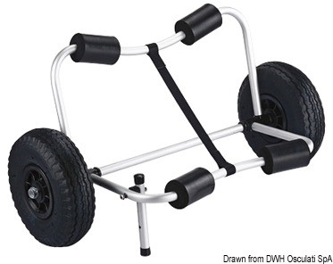 Carrellino in alluminio anodizzato con ruote pneumatiche, progettato per il trasporto di canoe o kayak anche sulla sabbia, grazie alle ruote a larga sezione Ø 260x90 mm larghezza.