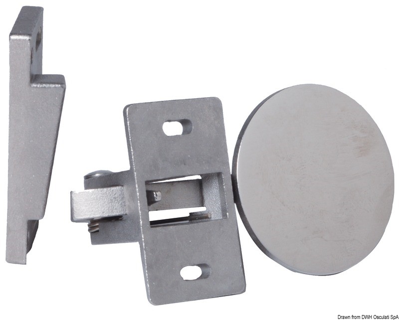 Si monta all’interno dell’antina lasciando un foro che viene chiuso dalla parte lucidata a specchio; per aprire l’antina si esercita una pressione sul foro che funge anche da maniglia. Contropiastra con dente inclinato per maggior facilità di installazione.
