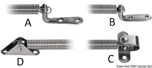 In acciaio inox a molla per apertura portellini, completi di cavallotto a forcella più piastrina a “L” per attacco. Dotati di cavetto di sicurezza inox per evitare l’allungamento delle molle.