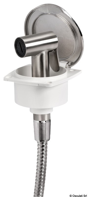 Doccia in acciaio inox, vano di alloggiamento bianco in ASA UV resistente.
