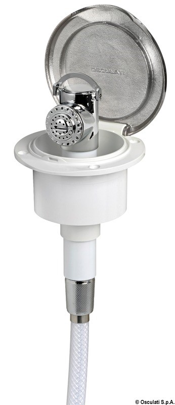 Doccia in ottone cromato, vano di alloggiamento bianco in ASA UV resistente.
