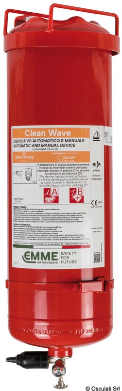 Omologati RINA, CE automatici a gas estinguente ecologico. Questo prodotto sostituisce l’Halon 1301 ed agisce a saturazione di ambiente. Rispetto alla polvere estinguente, non lascia alcun residuo per cui, anche in caso di apertura accidentale, non occorre ripristinare tutta la meccanica e accessoristica intasata dalla polvere estinguente. Il kit é composto da: bombola caricata a gas HFC-227 o FK-5-1-12 (ex NOVEC) + valvola speciale SPRINTVALVE ad attivazione termica a 93°+ cavetto con maniglia per comando a distanza, lunghezza 6 m accorciabile + staffa fissaggio estintore. Agendo per saturazione questo impianto non richiede tubazioni e ugelli supplementari. Per cubature maggiori, si possono usare più estintori.