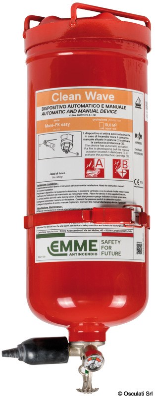 Omologati RINA, CE automatici a gas estinguente ecologico. Questo prodotto sostituisce l’Halon 1301 ed agisce a saturazione di ambiente. Rispetto alla polvere estinguente, non lascia alcun residuo per cui, anche in caso di apertura accidentale, non occorre ripristinare tutta la meccanica e accessoristica intasata dalla polvere estinguente. Il kit é composto da: bombola caricata a gas HFC-227 o FK-5-1-12 (ex NOVEC) + valvola speciale SPRINTVALVE ad attivazione termica a 93°+ cavetto con maniglia per comando a distanza, lunghezza 6 m accorciabile + staffa fissaggio estintore. Agendo per saturazione questo impianto non richiede tubazioni e ugelli supplementari. Per cubature maggiori, si possono usare più estintori.