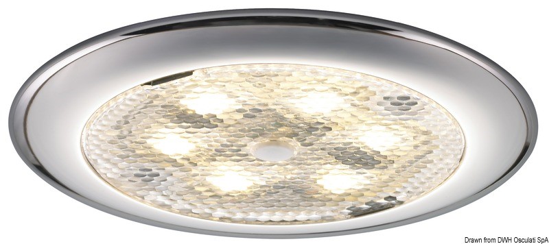 Corpo in acciaio inox. Fissaggio tramite viti nascoste dal frontalino. Completa di 2 lenti frontali di diversa trasparenza.
