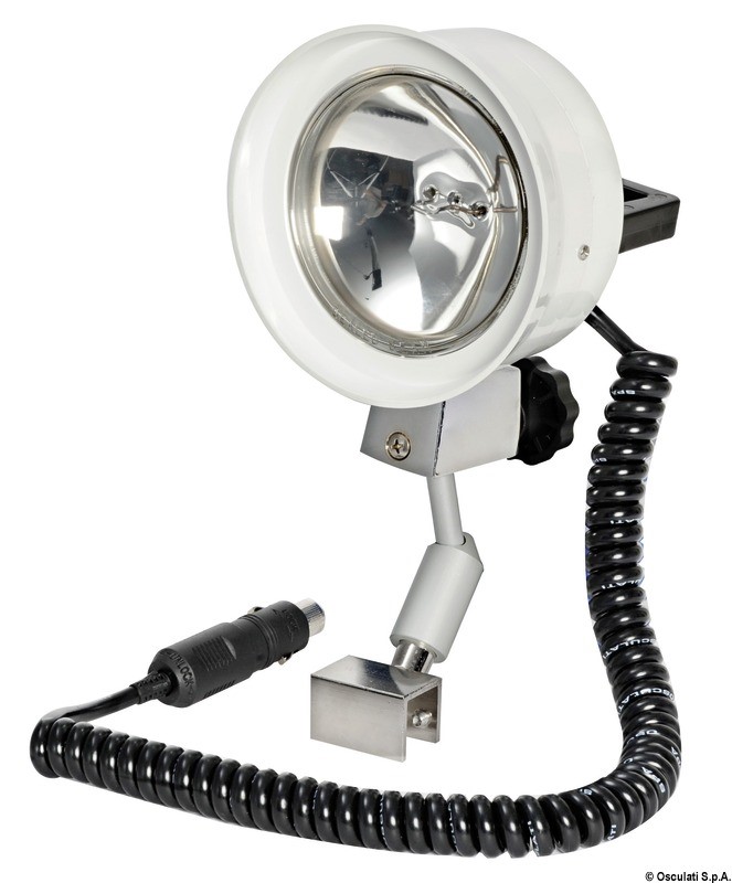 Caratteristiche tecniche: 1) costruiti in ABS bianco, con parti in ottone cromato; 2) bulbo ottico 4” "General Electric” a perfetta tenuta stagna; 3) snodo ad attrito registrabile che permette al faro rotazione a 360°; 4) faro sfilabile dal basamento, con cavo di corrente estensibile; 5) interruttore incorporato sulla calotta del faro; 6) inalterabilità del bulbo G.E. che, essendo sotto vuoto non ha la possibilità di ossidazione della parabola argentata; 7) spina con LED; 8) presa accendisigari inclusa; 9) Faro sfilabile svitando il pomello. Completo di spina stagna terminale al cavo, che può essere installato sia ad incasso che in piano.