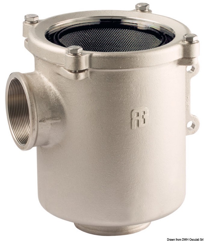 In bronzo nichelato con disco in policarbonato; modello a tazza con una bocca laterale ed una sul fondello. Elemento filtrante in acciaio inox AISI 316L e guarnizioni in neoprene.