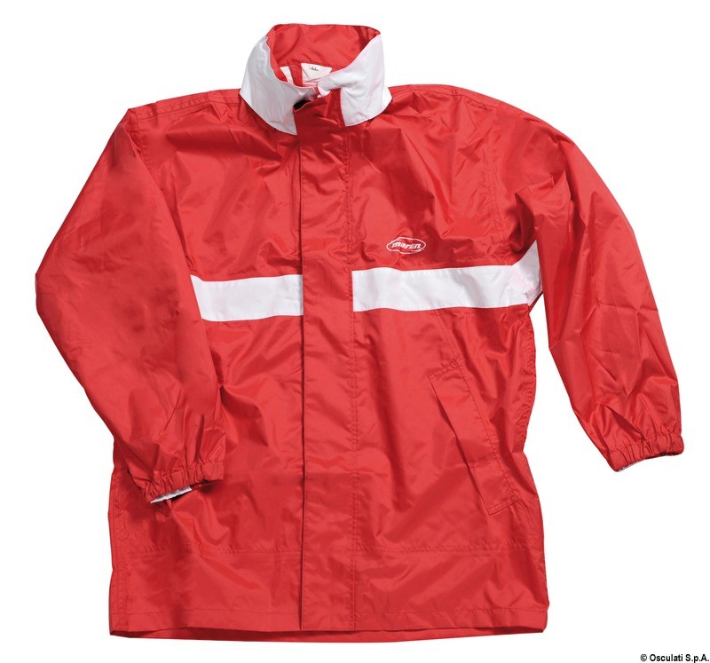 Giacca: chiusura con cerniera inossidabile + patella di protezione con velcro, due tasche anti-acqua, cappuccio impermeabile pieghevole e regolabile inserito nel collo.