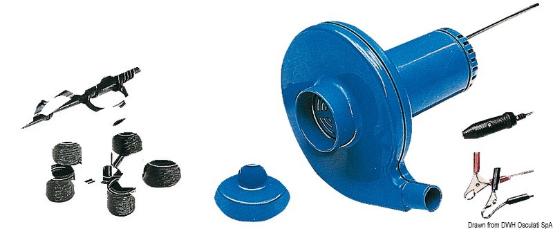 Gonfiatori/sgonfiatori elettrici per piccoli battelli o materassini o comunque qualsiasi gonfiabile in gomma, completi di raccordi di vari diametri. Gonfia e sgonfia.