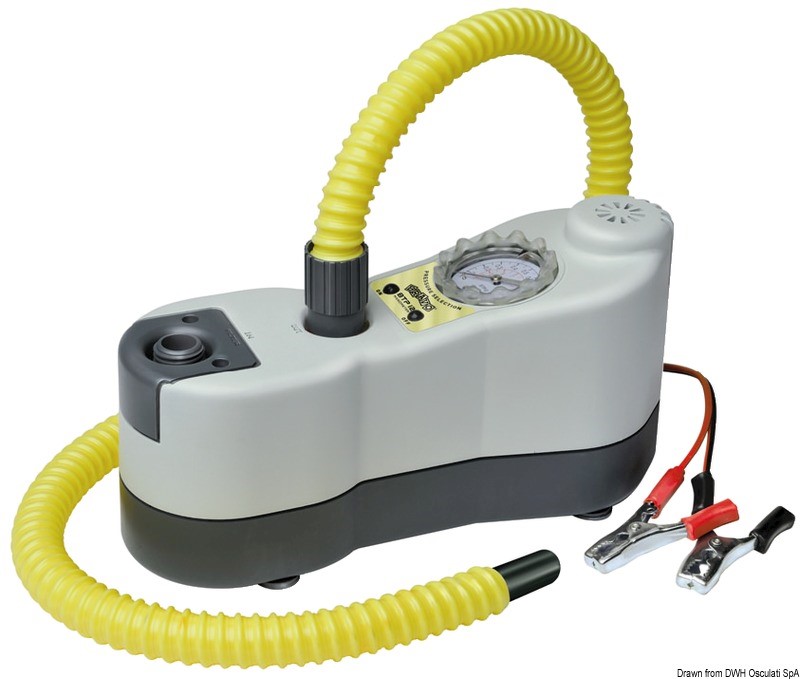 Arresto automatico alla pressione selezionata regolabile tramite manometro. Dotato di filtro per l’aria. Completo di sacca, tubo da 1,7 m; cavo di alimentazione da 3 m; raccordi universali, spinotto per accendisigari e morsetti per batteria 12V.