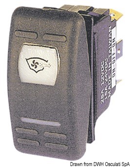 Impermeabili IP56 serie Marina, richiedono per l’installazione un foro rettangolare da 21,5x36,8 mm. Capacità massima 20 A a 12 V e 12 A a 24 V. Completi di doppio LED di colore rosso: uno che illumina il simbolo dell’utenza, sempre acceso, il secondo che illumina una apposita fessura sotto il simbolo che si accende quando si attiva l’utenza. Bascula da ordinare a parte.