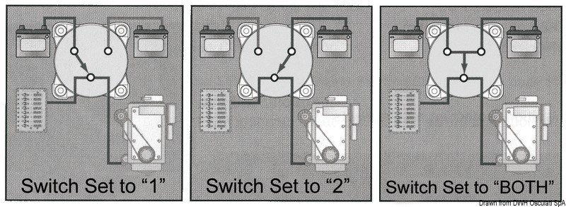 Deviatore con posizioni: Batt. 1 - Batt. 2 - Batt. 1+2 - OFFTensione 12 e 24 volt