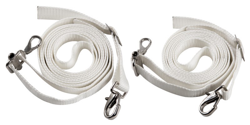Un'estremità con moschettone e cinghia per regolazione fissa e una con moschettone di tensionamento.