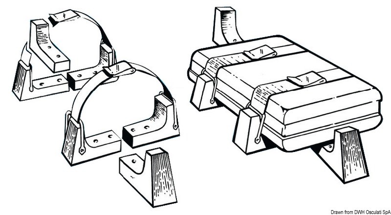 Fissaggio in coperta o paratia; kit completo di supporti, fasce in poliestere pesante, ganci e fibbie in acciaio inox per lo sganciamento rapido. Modello universale per le nostre zattere.