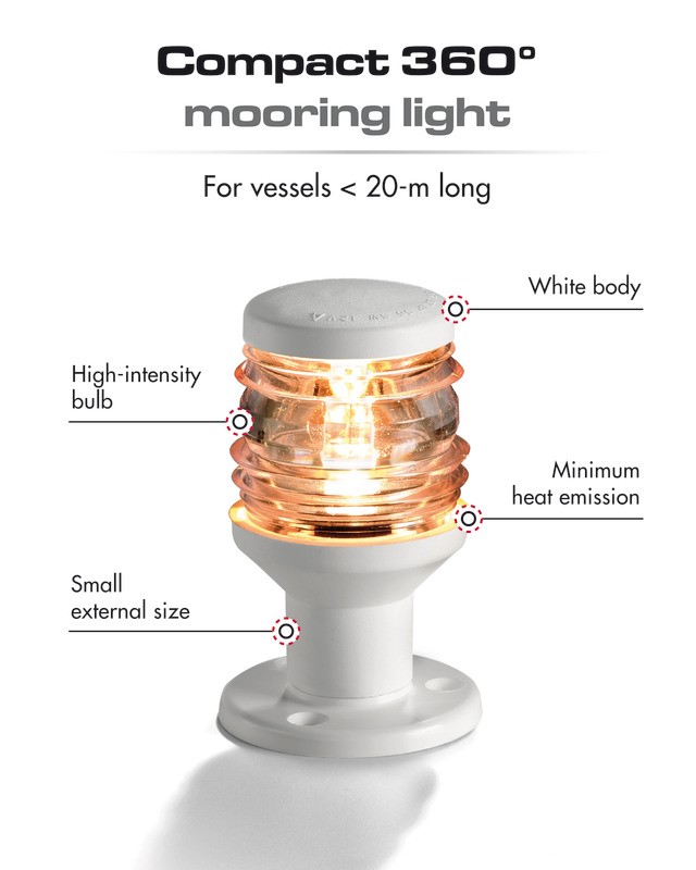 Approvate RINA in accordo al regolamento COLREG72. Presentano la prerogativa di essere alimentate da una piccola lampadina alogena ad alta intensità da 5 W, allo scopo di avere dimensioni esterne ridottissime, minimo sviluppo di calore e basso consumo di corrente. Fissaggio con solo due viti.
