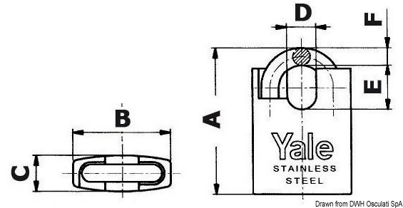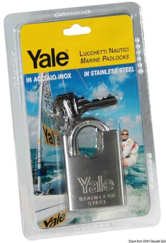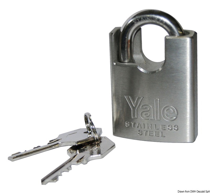 Completamente (corpo, arco, molle) in acciaio inox. Con doppio catenaccio di chiusura e foro drenaggio umidità. Venduti in blister espositivo YALE.