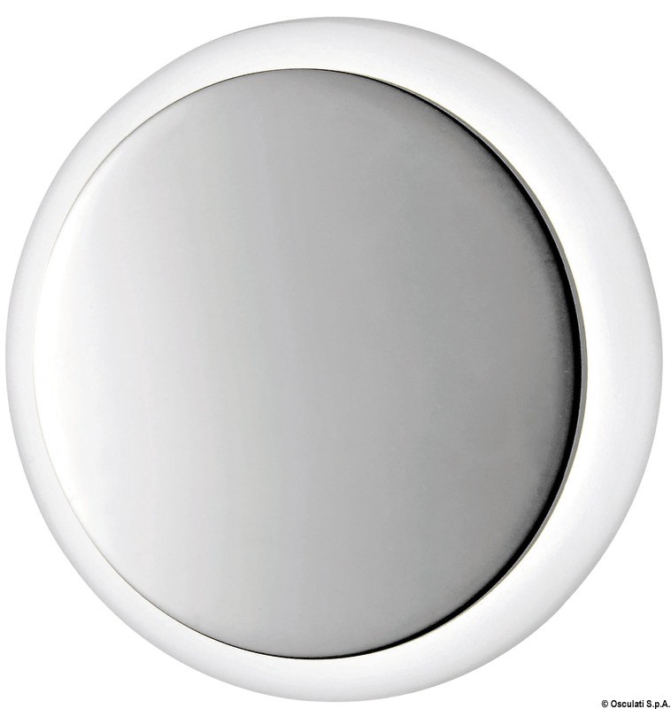 Corpo in plastica bianca, frontale in acciaio inox lucidato a specchio. Montaggio a scatto.
