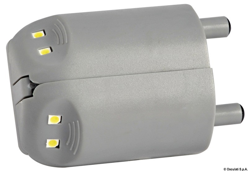 Accensione a pressione (all'apertura sportello). Adatta per armadi, gavoni, ripostigli a 1 o 2 ante. Fissaggio con piastrina a baionetta o autoadesivo. Batterie incluse.