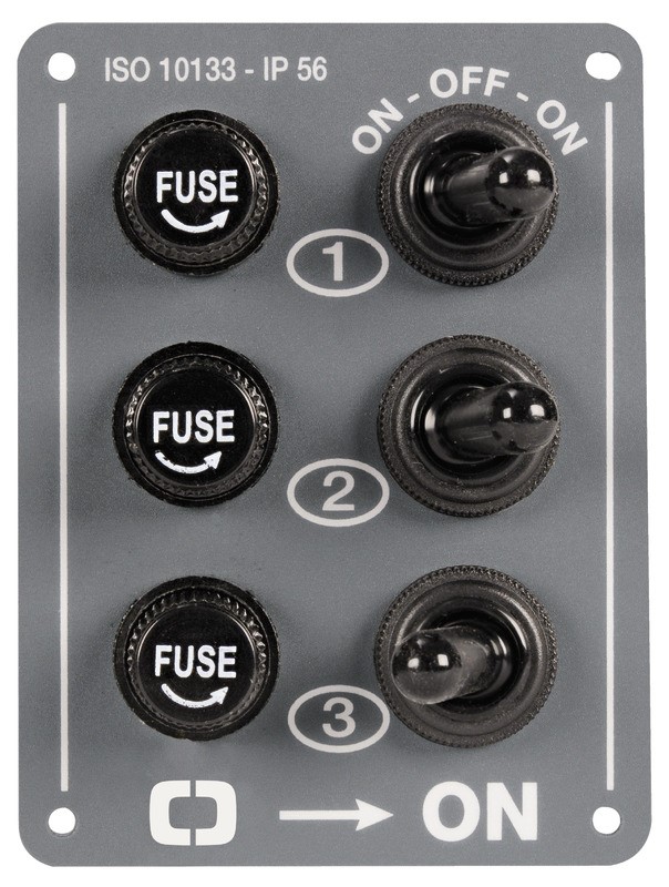 Interruttori con cappuccio in gomma e portafusibili in vetro da 6x32 mm. Pannello in alluminio grigio. Grado di protezione IP56. Interruttori ON-OFF tranne il primo (ON-OFF-ON) e l’ultimo (ON-OFF) con ritorno a molla per tromba.