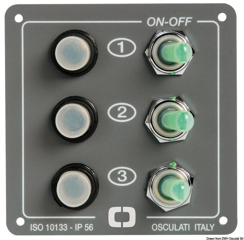 Interruttori a levetta luminosi. Fusibili automatici riarmabili.