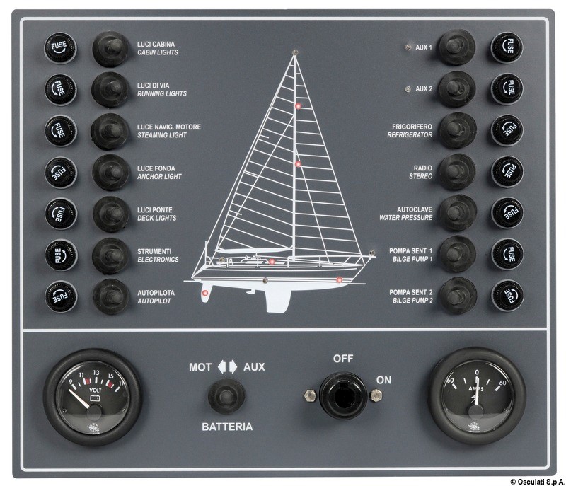 Completi di voltometro e amperometro e di staccabatteria 14.385.00. Completi di check-panel a LED extra luminosi che si accendono in corrispondenza dell’utenza in uso.