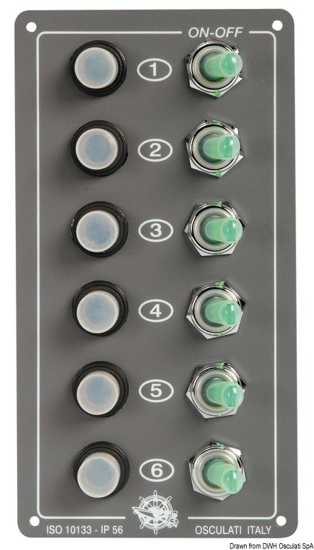 Interruttori a levetta luminosi. Fusibili automatici riarmabili.