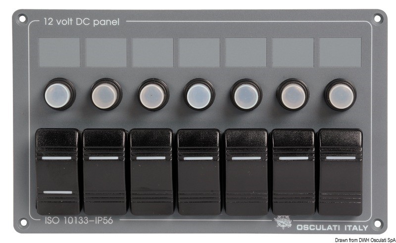 Provvisti di interruttori a bascula stagni, con incorporata illuminazione in posizione ON. Il primo ha 3 posizioni con ON-OFF-ON con due circuiti separati, l'ultimo é a molla per la tromba. Completi di fusibili automatici riarmabili stagni (14.845.06: 3 da 10 A, 2 da 15 A, 1 da 20 A; 14.855.07: 4 da 10 A, 2 da 15 A, 1 da 20 A). Grado di protezione IP56. In dotazione le tabelle complete in policarbonato autoadesivo, con scritte delle varie funzioni, sia in italiano, inglese, tedesco.
