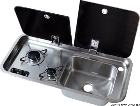 Completo di lavello e rubinetto con miscelatore acqua calda/fredda.