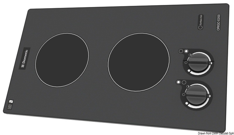 Comandi sul piano con accensione di sicurezza, spie di controllo per segnalare la piastra accesa, o in ogni caso ancora calda anche se spenta. Riscaldamento veloce ed uniforme (3 secondi). Alimentazione a 220 V.