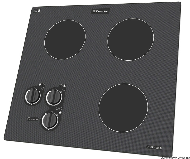 Comandi sul piano con accensione di sicurezza, spie di controllo per segnalare la piastra accesa, o in ogni caso ancora calda anche se spenta. Riscaldamento veloce ed uniforme (3 secondi). Alimentazione a 220 V.