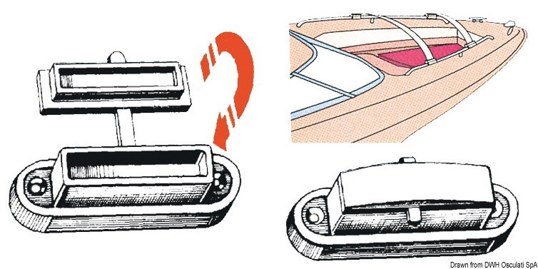 In ottone cromato, per creare, fissandole sul bordo interno del trincarino, un arco supporto telone. Sono complete di cappuccio in PVC bianco.