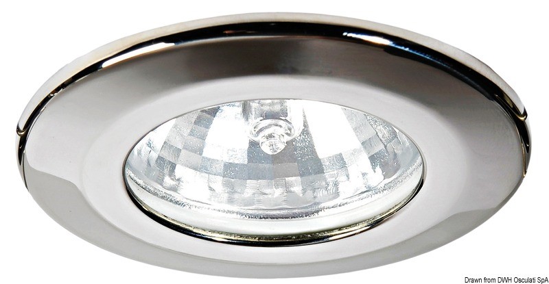 Corpo in acciaio inox. Lente in vetro. Parabola dicroica. Sistema di fissaggio con molle interne.