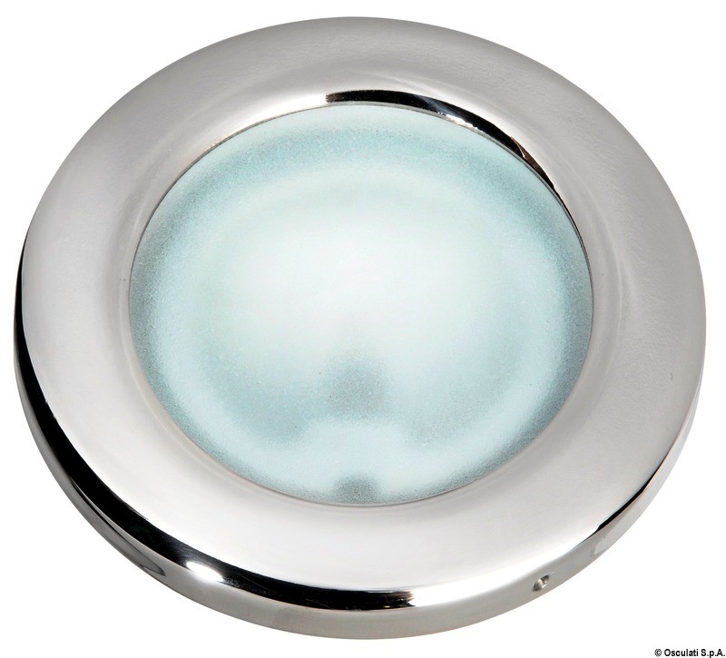 Corpo in alluminio rivestito con resina epossidica bianca, ghiera in acciaio inox. Lente in vetro satinato. Fissaggio tramite viti nascoste dal frontalino.