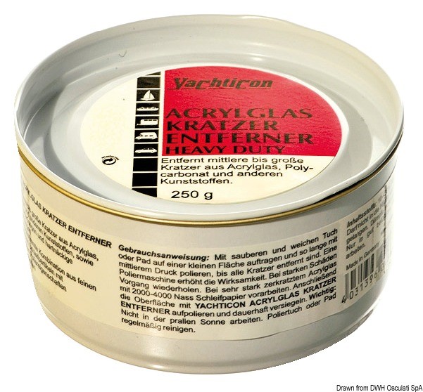 Rimuove da plexiglass/policarbonato/plastica (oblo, passi uomo, parabrezza) sfrisi, ossidazioni forti, decolorazioni, ecc. Compound contenente abrasivi extra-fini con proprietà lucidanti.