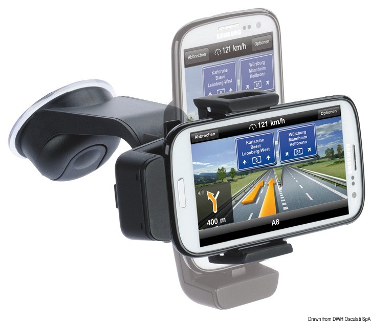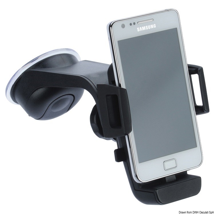 Accetta tutti gli apparati con larghezza da 48 a 81 mm, con o senza cover protettiva. Fissaggio con ventosa o autoadesivo. Rotazione a 360°. Completo di presa micro USB regolabile in profondità per adattarsi ai vari smartphone con o senza custodia.