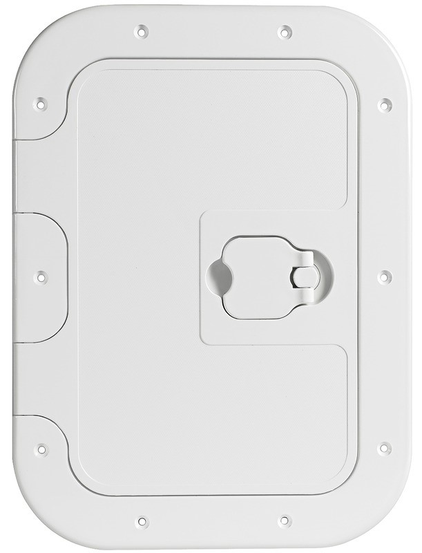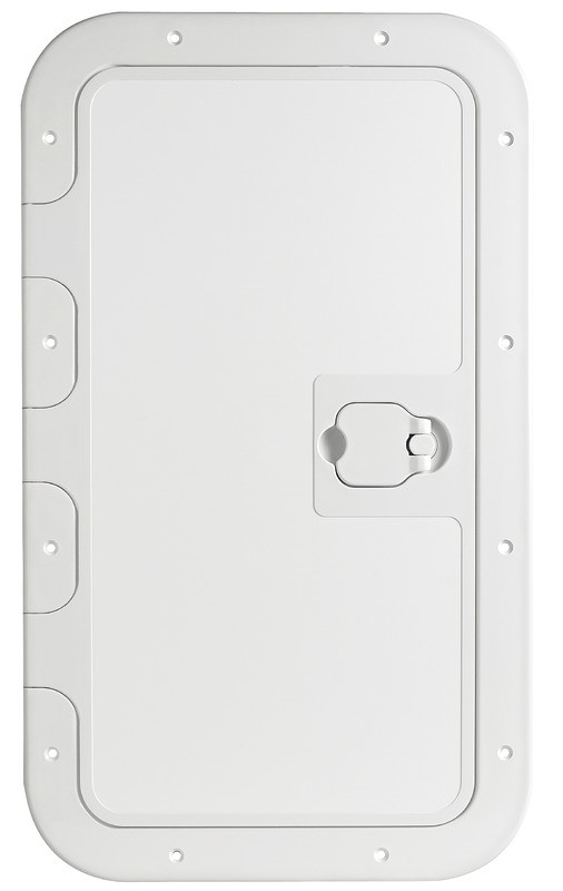 Chiusura del coperchio Splash-Proob con guarnizione in neoprene. Montaggio a filo. Si possono usare come portelli per gavoni, vasche da pesca, oppure come portelli di ripostigli e paratie apertura a 160°.