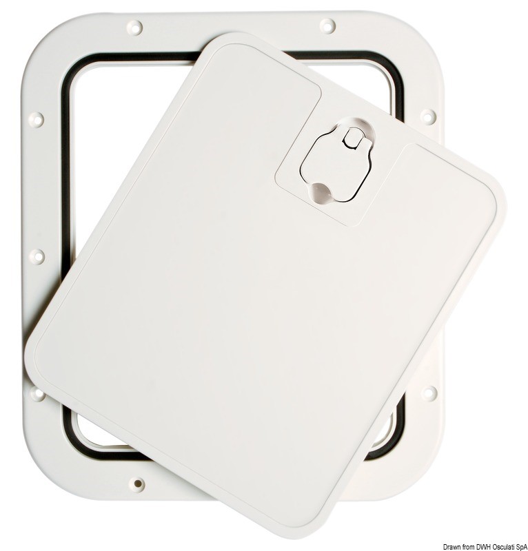 Superficie molto robusta e antisdrucciolo. Chiusura del coperchio Splash-Proof con guarnizione in neoprene. Montaggio a filo. Si possono usare come portelli per gavoni, vasche da pesca, oppure come portelli di ripostigli e paratie frontale a baionetta che si estrae per facilitare l'accesso. Ideale per installazioni in console con panca guida vicina.