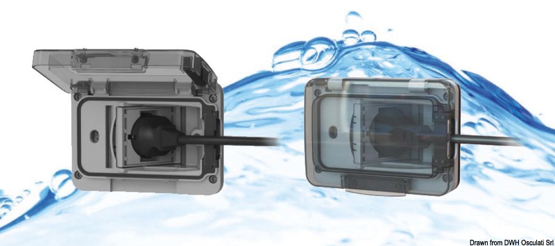 Presa di corrente stagna IP55 anche a spina inserita. Dimensioni DIN standard 3 moduli.