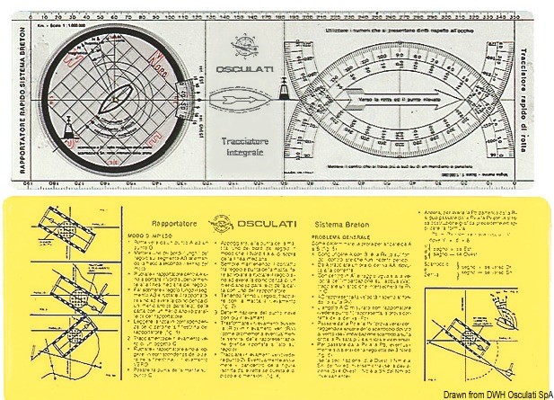 Racchiude in un solo strumento sia il rapportatore Bretone, che il rapportatore rapido sistema “Jean CRAS”. Completo di custodia e di istruzioni. Permette di misurare distanze, correggere declinazioni, trasportare un punto rilevato, tracciare il rilevamento vero di un rilevamento costiero, rotte in base alla graduazione della bussola ecc.