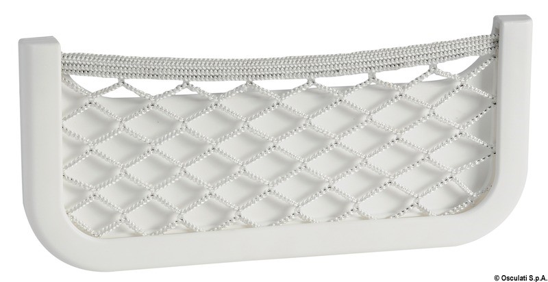 Telaio in ABS bianco, con rete elestica in nylon intrecciato. Dorso autoadesivo, oppure da fissare con 4 viti.