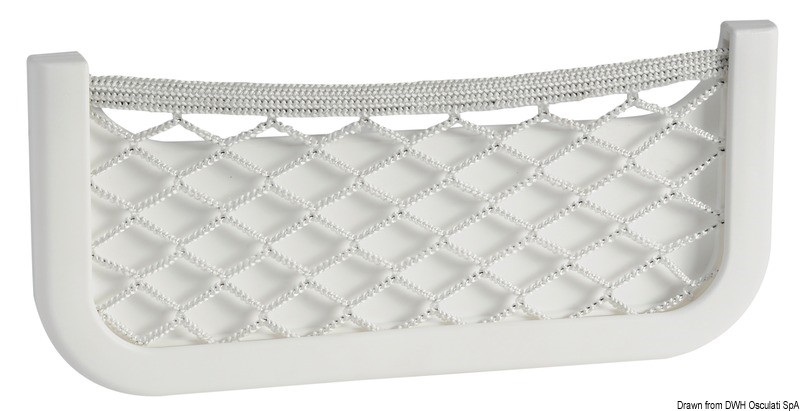 Telaio in ABS bianco, con rete elestica in nylon intrecciato. Dorso autoadesivo, oppure da fissare con 4 viti.