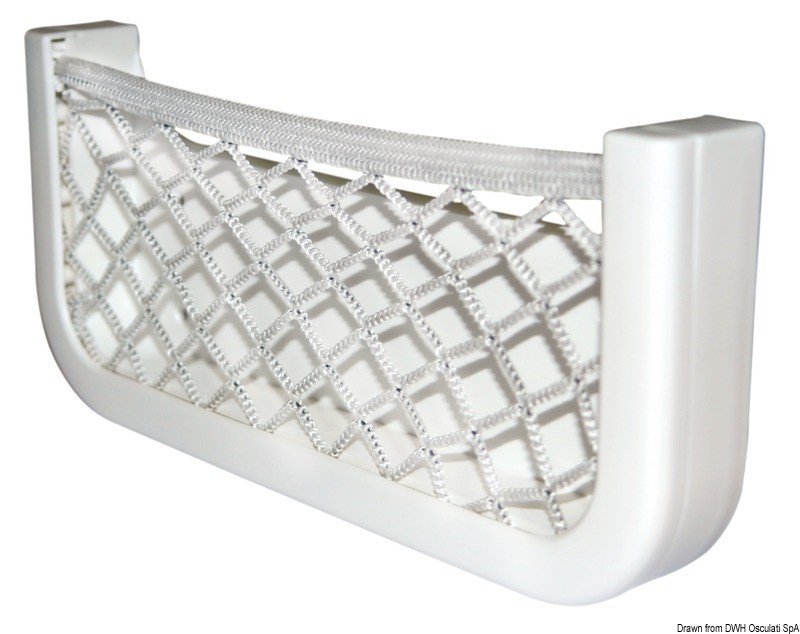 Telaio in ABS bianco, con rete elestica in nylon intrecciato. Dorso autoadesivo, oppure da fissare con 4 viti.