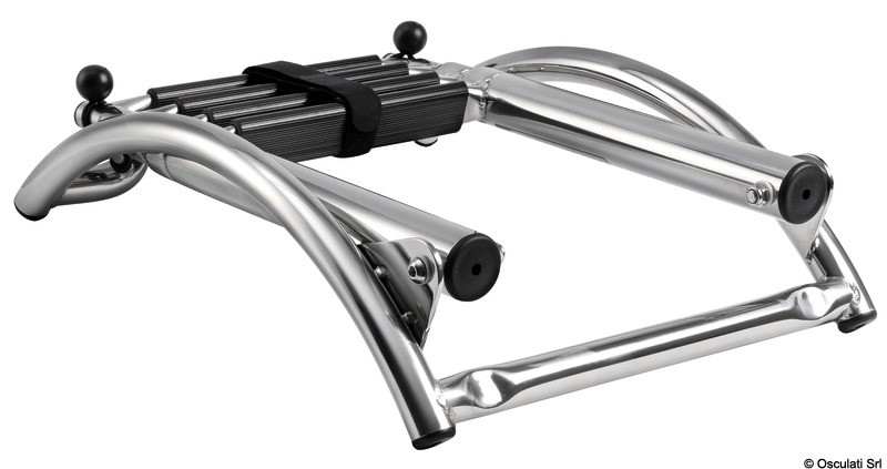 In acciaio inox lucidato a specchio. Gradini con pedana in plastica antisdrucciolo.