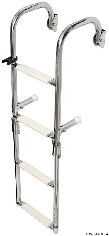 In acciaio inox lucidato a specchio con attacchi arcuati sopra coperta, per una più comoda risalita. Modello con gradini con superficie ovalizzata. Il gradino ovale, rispetto ai tradizionali tondi, é molto più agevole e comodo nell’uso. I gradini nella parte superiore sono ricoperti di pedana in plastica antiscivolo.